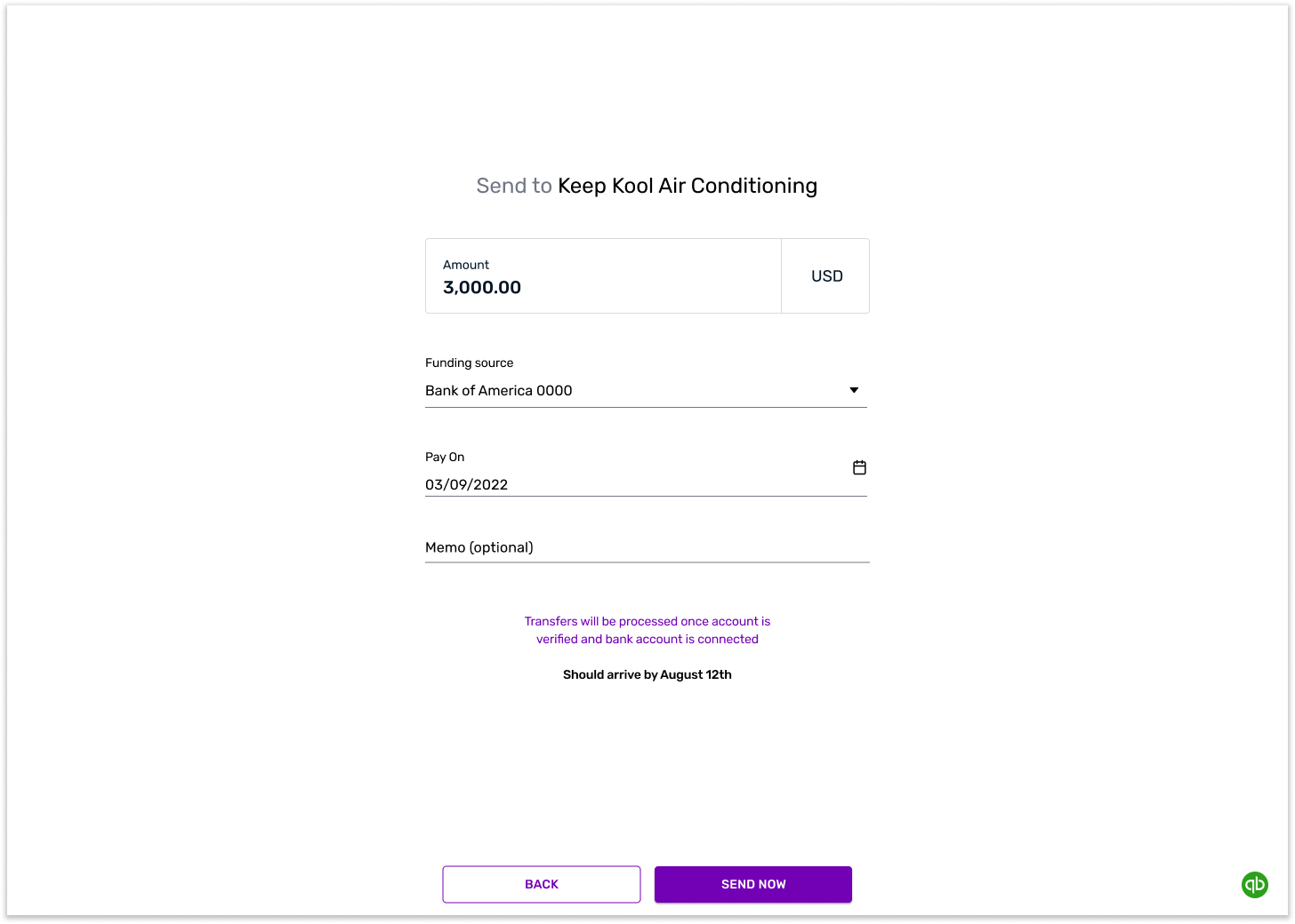 The workflow begins in QuickBooks, then a payment platform to initiate that transfer, and finally back to QuickBooks to mark the bill as paid.