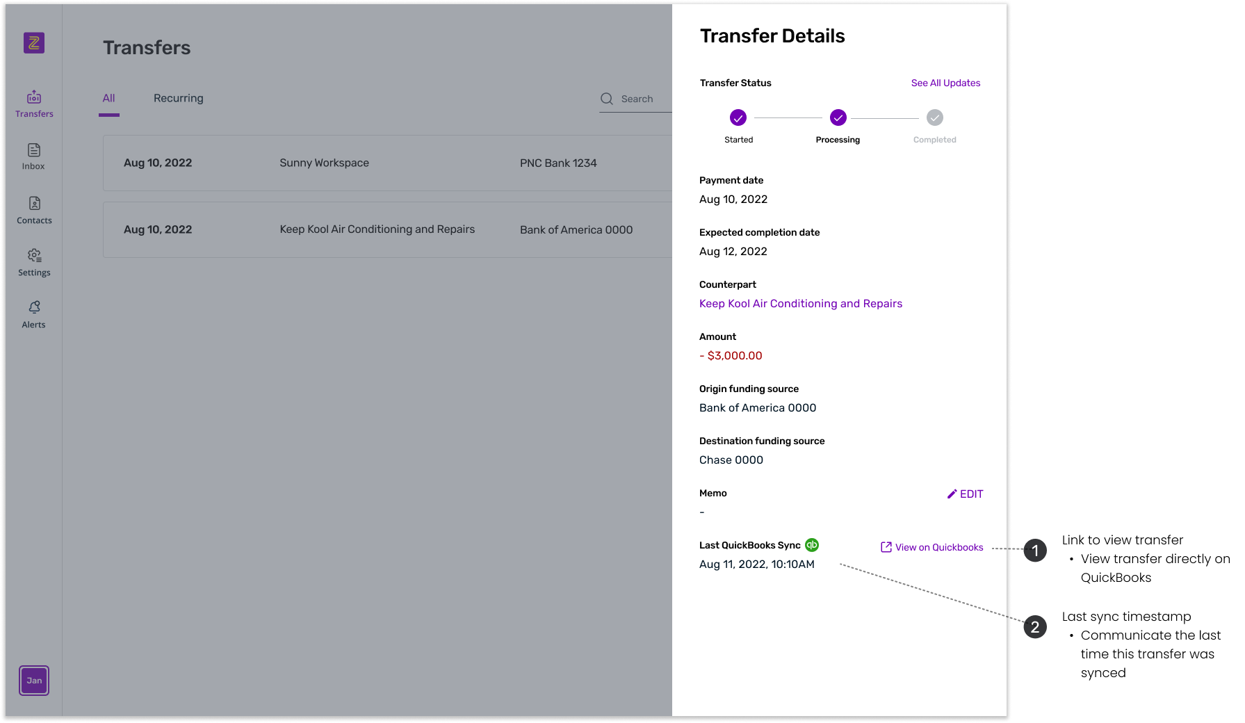 We addressed this by adding detailed syncing information in the transfer details panel. This allowed bookkeepers to check when an in synced, and even view the transfer in QuickBooks.